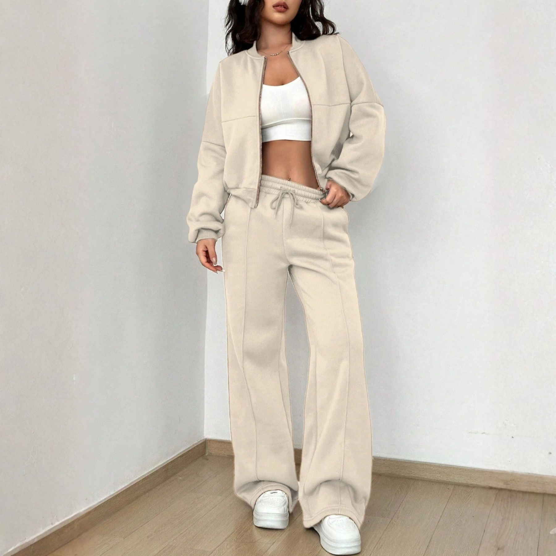 Stilvolle Details – Die moderne Zip-Up Jacke und die trendigen Jogginghosen schaffen einen eleganten, aber lässigen Look.