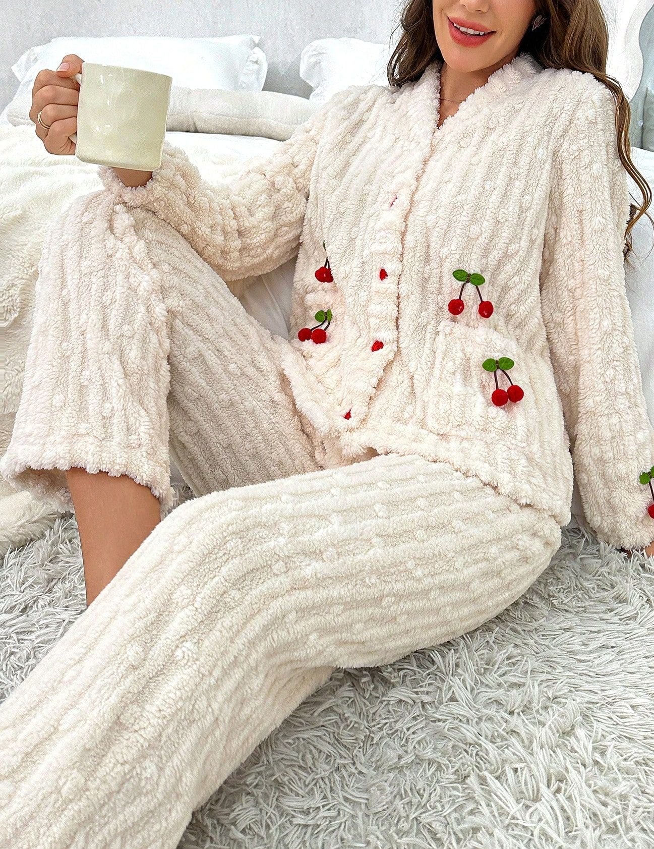 Bequemes Damen Pyjama Set mit Kirschmuster, langärmeliges Flanell Zweiteiler Nachtwäsche